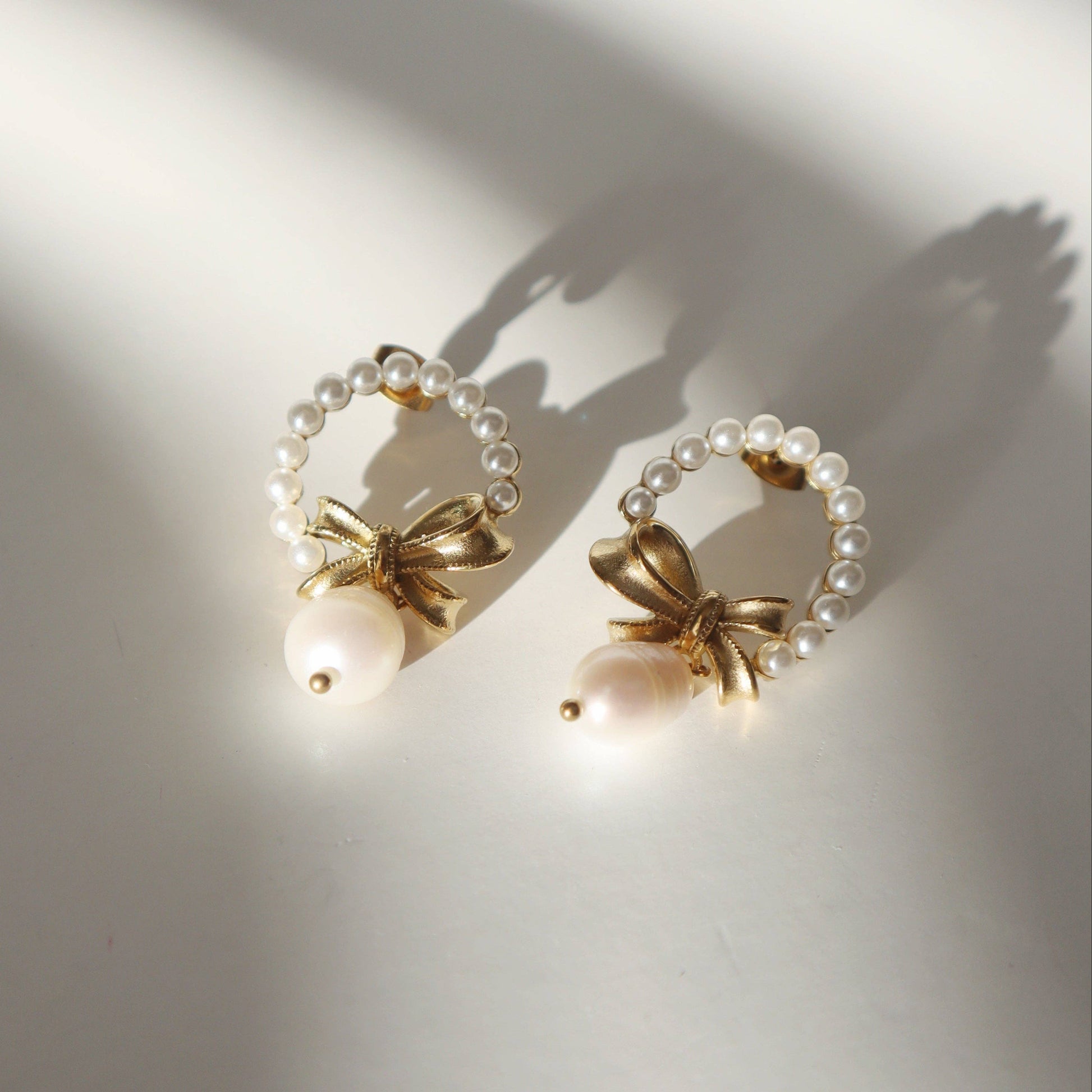 These earrings feature a delicate circle of tiny pearls reminiscent of a graceful halo, finished with a gold bow and a single pearl drop for a soft, romantic touch. Their design blends timeless elegance with subtle charm — perfect for the holidays yet refined enough for year-round wear.